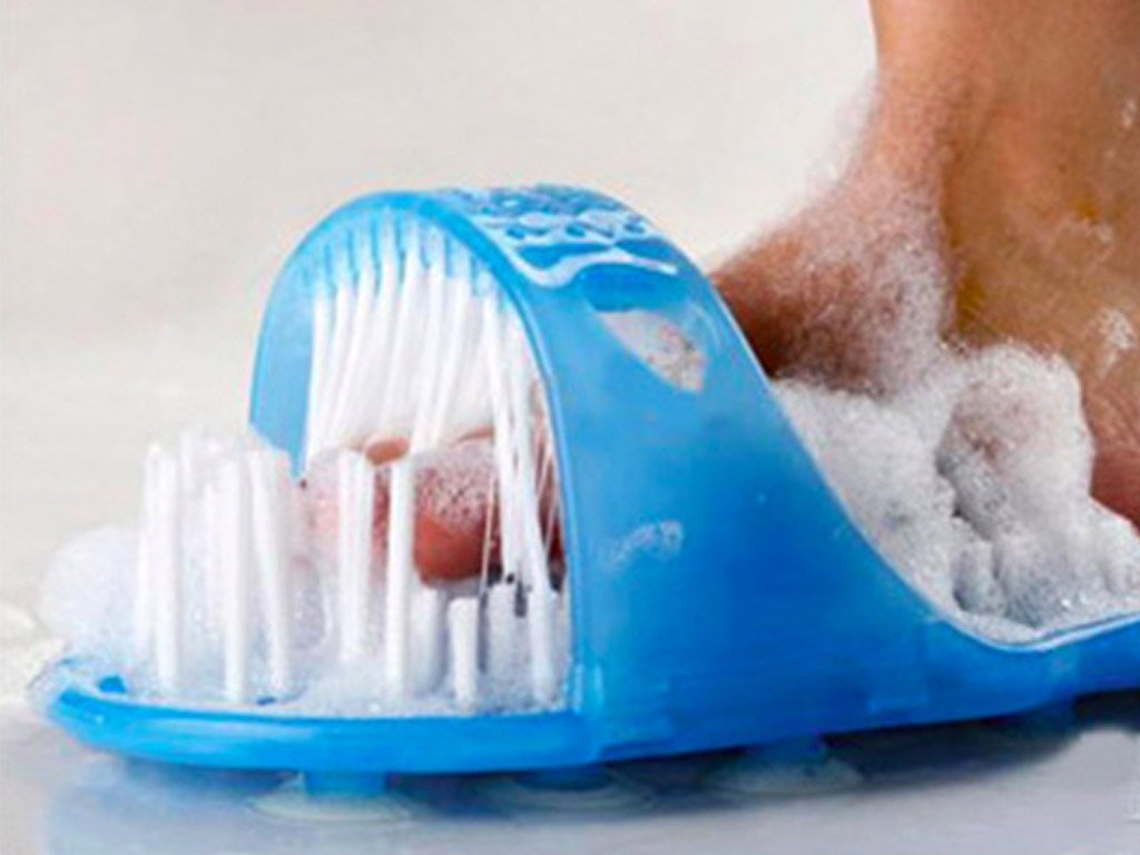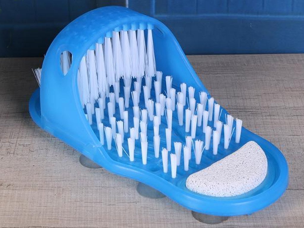 Fötterborstformad som sandal är lätt att fånga tack vare sug på botten av badkaret. I hälutrymmet innehåller denna borste sten för att minska härdad hud på hälarna!