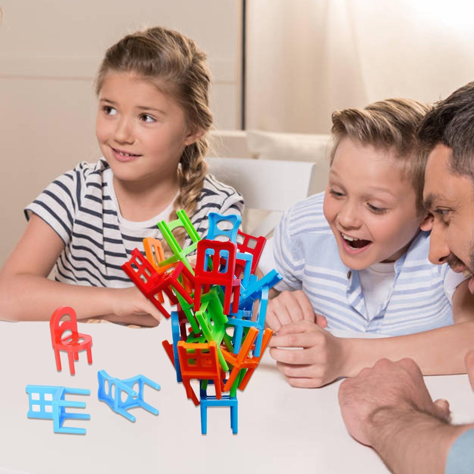Målet med spelet är att stapla stolar ovanpå varandra utan att kollapsa strukturen. Det är ett bra alternativ till tärningar eller Jenga.