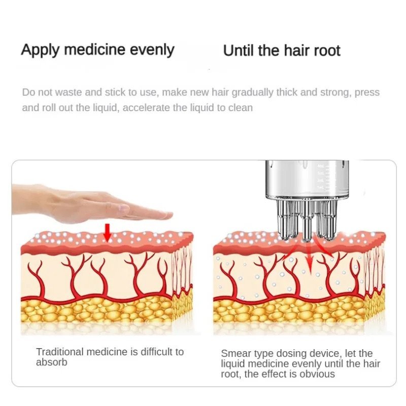 Kombinerar applicering av hårserum och skalpmassage, vilket säkerställer optimal absorption av det flytande serumet samtidigt som blodcirkulationen främjas. Regelbunden applicering av serumet på detta sätt kan stärka och vitalisera ditt hår från rot till topp. Applikatorn säkerställer att serumet fördelas jämnt över hela hårets längd.